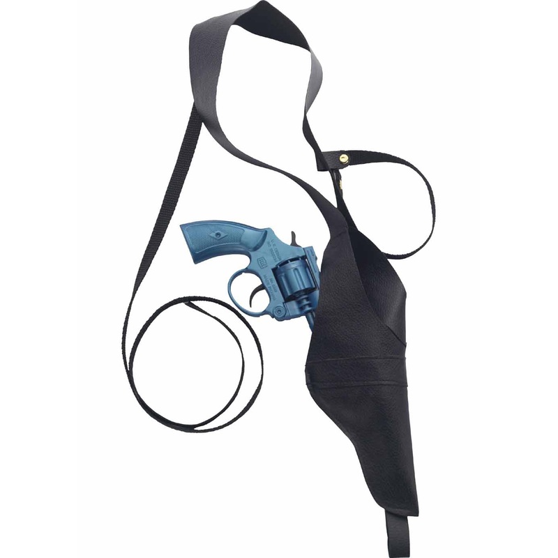 Black gangster holster with blue plastic gun.