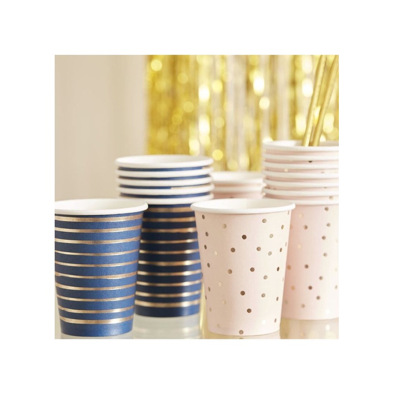 Mixed pack of 8 deluxe Gender Reveal themed paper cups. Contains 4 x gold foiled pink spotty cups and 4 x gold foiled navy striped cups.
