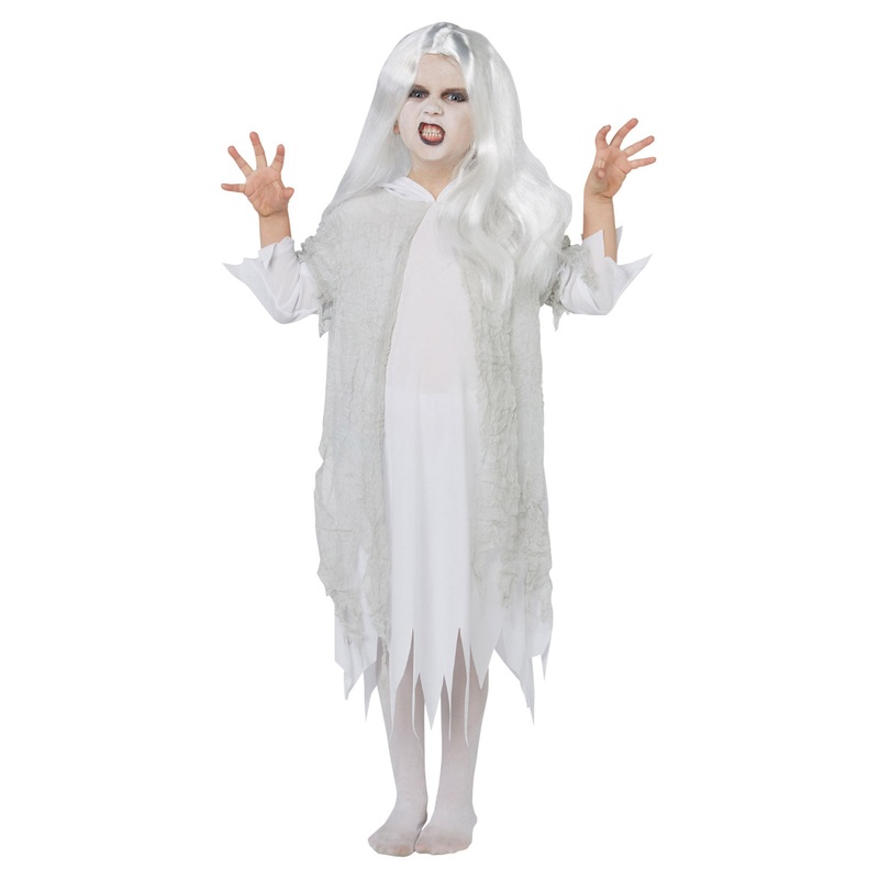 Ghostly Spirit fancy dress costume consisting of long white hooded robe with torn material decoration & matching white wig.SizeAgeHeightSmall3-4 yearsapprox 104cmMedium5-6 yearsapprox 116cmLarge7-8 yearsapprox 128cmNote: Measurements are manufacturer's gui