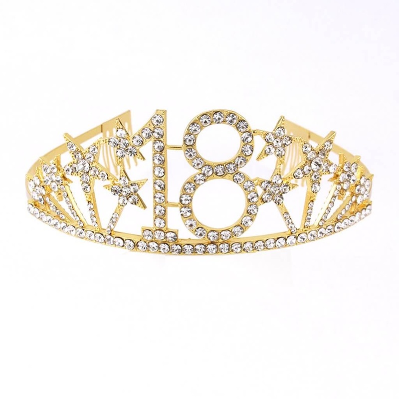 Gold Rhinestone 18th Birthday Tiara with Stars 18th Birthday Hair Accessory for Her.Celebrate your milestone in style with this Gold Rhinestone 18th Birthday Tiara. Crafted from premium metal and encrusted with sparkling rhinestones, this elegant crown fea