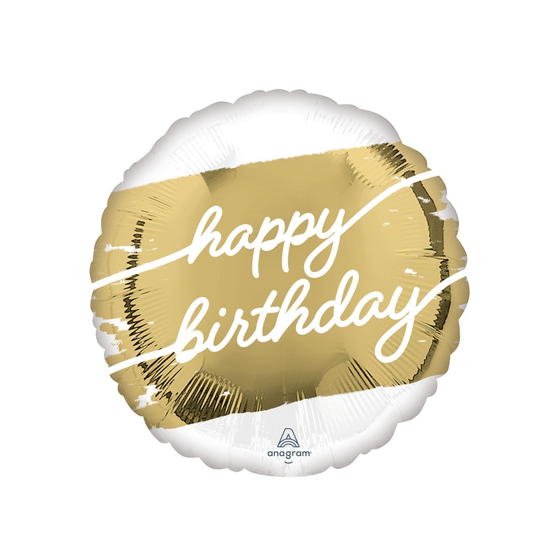 Gold and white 17 inch round Happy Birthday foil balloon.Click & Collect orders: Balloon supplied inflated with helium.Delivery orders: Balloon supplied deflated.Balloon comes with a plastic weight or choose a foil weight here. We guarantee our foilballoon