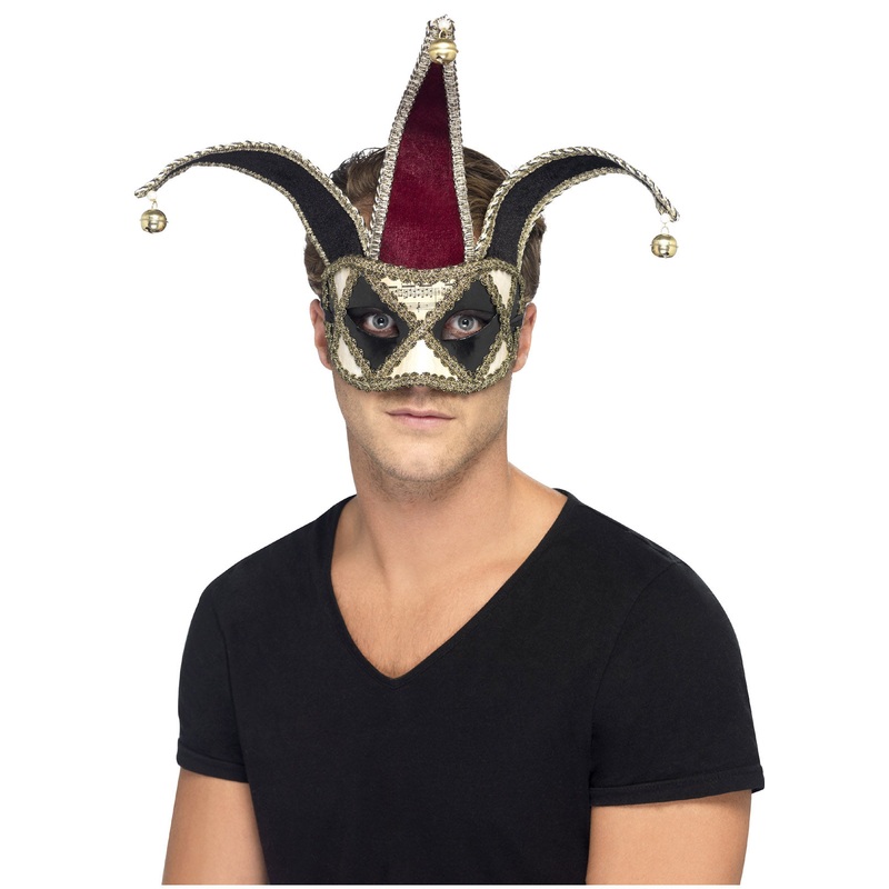 Gothic venetian red & black harlequin eye mask decorated with gold trim and bells.