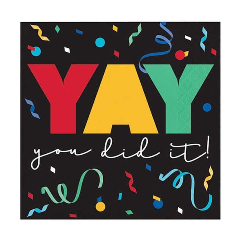 YAY Schools Out! Create a colorful graduation party atmosphere with our Grad Cap Toss tableware. Coordinating beverage napkins feature YAY you did it phrase and are perfectly sized for any mess and make cleanup a snap. Each package contains 16 beverage/cocktail napkins.