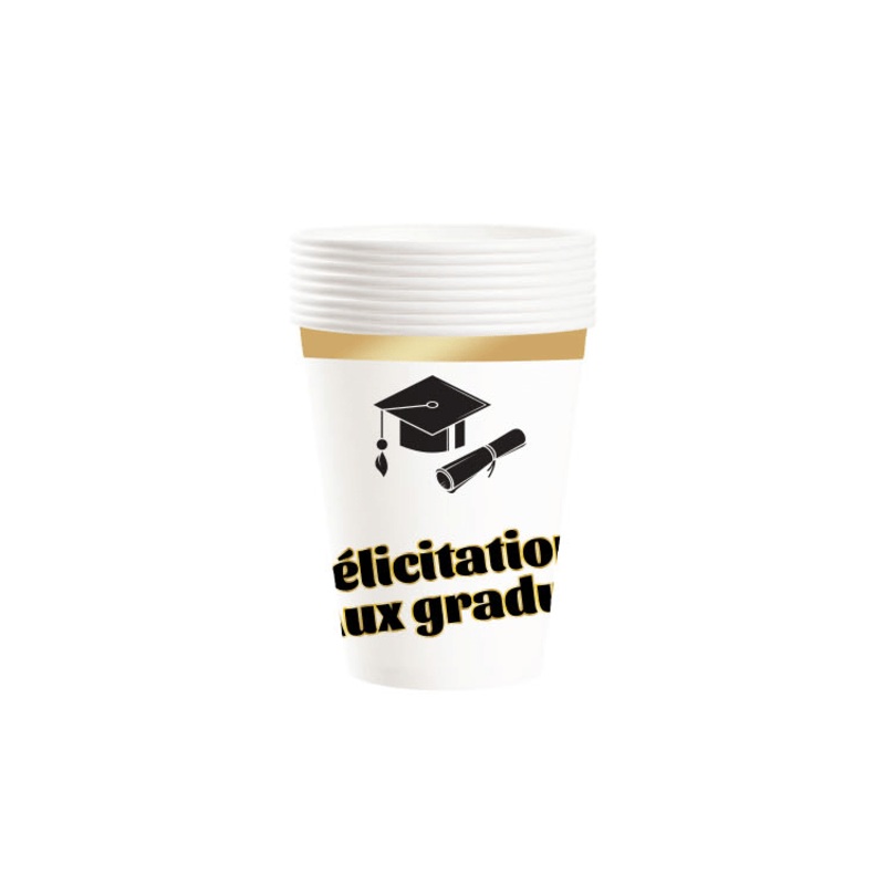 Celebrate academic success with Graduation Paper Cups French Version! This 8-count set of 9 ounce cups features a sophisticated white, black, and gold design, with a graduate hat at the center and the message "Flicitations aux gradus!". Perfect for graduat