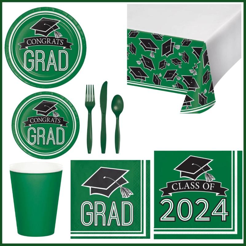 Our Grad Colors Green Party Kit for 16 people contains these 182 total items:18 Grad Colors Green Paper Dessert Plates18 Grad Colors Green Paper Dinner Plates36 Grad Colors Green Beverage Napkins36 Grad Colors Green Class of 2024 Lunch Napkins2 Grad Colors