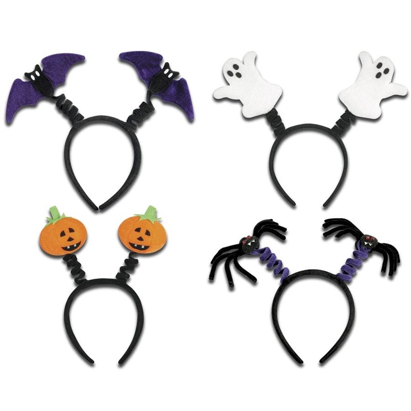 Wear these fun Bopper Headbands at your Halloween festivities which features Bats Ghosts Spiders and Pumpkins boppers attached to a black headband Halloween Boppers make great party favors and come in one size to fit most adults and teens One Halloween bop