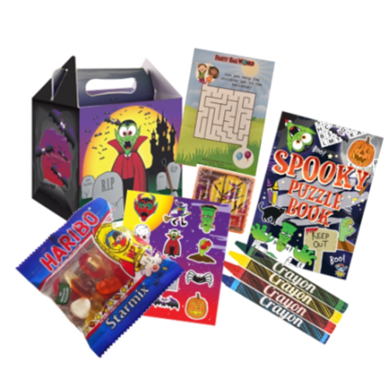 The perfect addition to your Halloween Party or a luxury trick or treat gift.Each Halloween Themed Lunch Box containsA Spookey Colouring Activity Book4 Wax CrayonsA Halloween Themed Sticker SheetA Halloween Maze GameA Treat Size Bag of Haribo (variety may