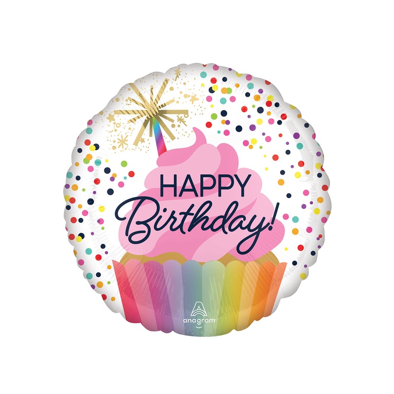 Dotted cupcake design 17 inch round Happy Birthday foil balloon.Click & Collect orders: Balloon supplied inflated with helium.Delivery orders: Balloon supplied deflated.Balloon comes with a plastic weight or choose a foil weight here. We guarantee our foil