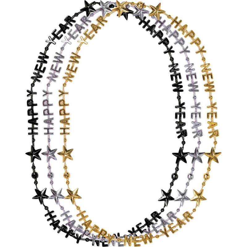 Celebrate the New Year in style with our Happy New Year Letter Necklace, 3 ct! These plastic necklaces measure 32 inches and feature stars and the words "Happy New Year" with a silver, gold, and black theme. Perfect for New Year's Eve parties, these neckla