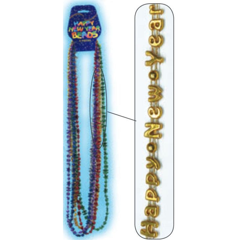 These themed beads are great for wearing at big party events like New Years celebration. Accessorize your outfit with these assorted color Happy New Year beads or hand out to party guests as party favors. The set includes 6 metallic assorted color 35-inch
