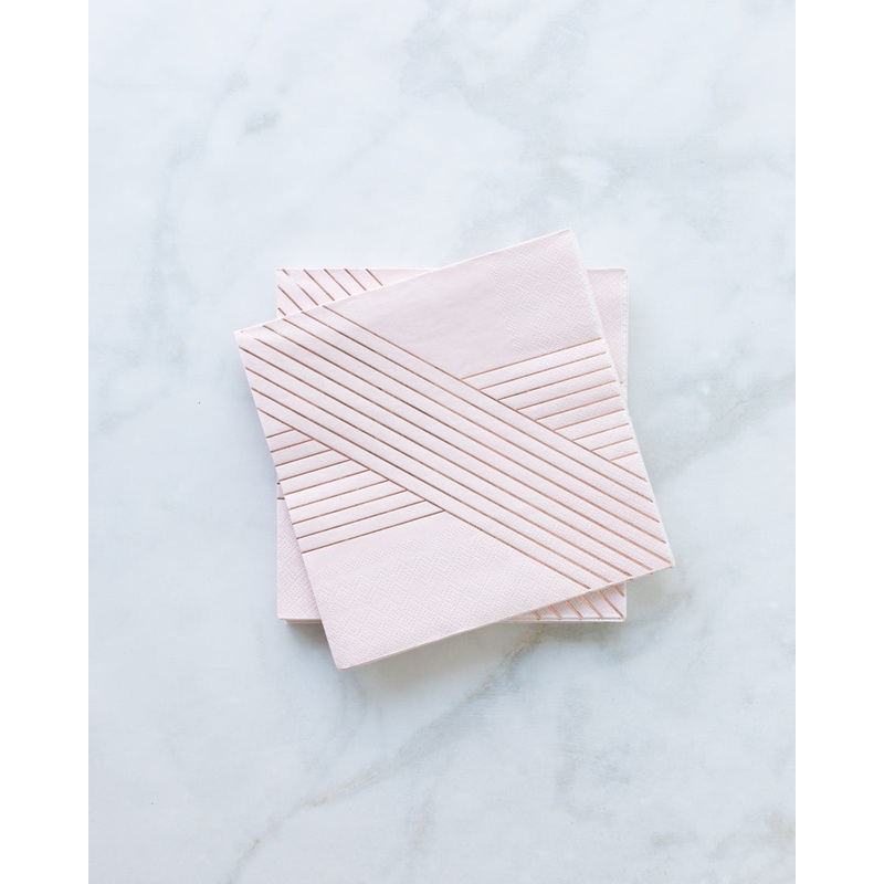 Pack of 20.FeaturesElegant pale pink lunch napkins inset with elegant gold stripes add a dash of style to your tabletop and buffet station.DetailsColor Palette:Pale pink, rose gold foilQuantity:pack of 20Dimensions: 7.5 x 7.5 inchesMaterial: paper