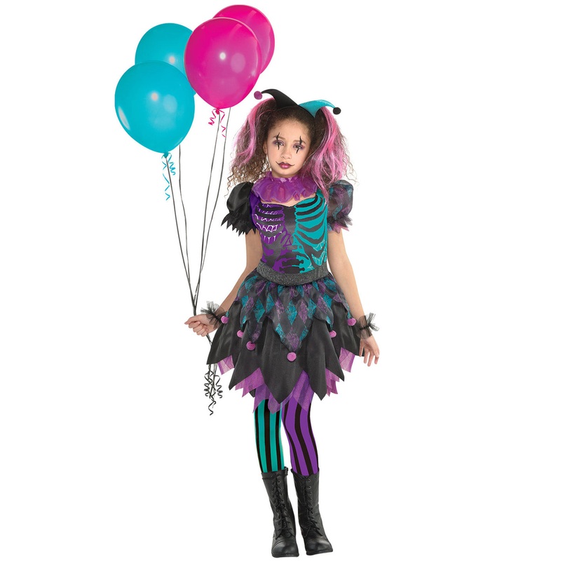 Harlequin jester Halloween costume which comes with dress with underskirt, headband, collar, wrist cuffs and tights.SizeAgeSmall6-8 yearsMedium8-10 yearsLarge10-12 YearsExtra Large12-14 YearsNote: Measurements are manufacturer's guide.