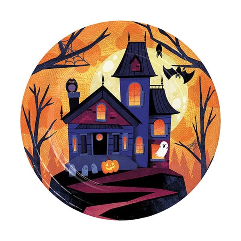 Improve your All Hallows Eve dining experience with Haunted House tableware that gives some spooky vibes for the occasion. These haunted house dinner plates with ghost and bats design are perfect for serving food prepared by ghosts and goblins. The pack includes 8 premium strength paper plates.
