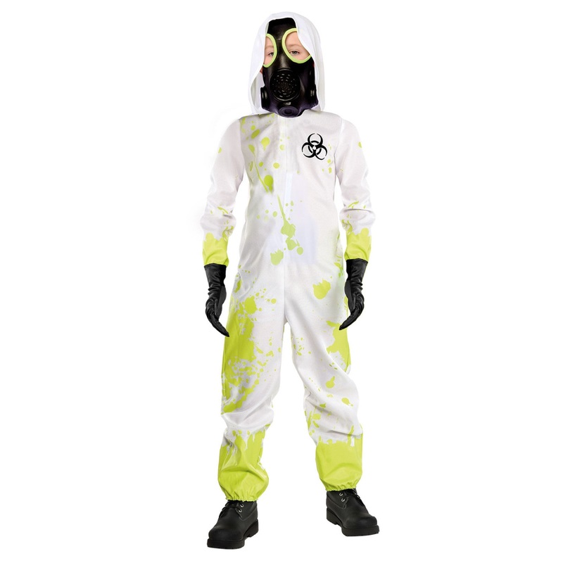 Full zombie apocalypse children’s Halloween costume including hazmat jumpsuit with hood, mask and pair of black gloves.