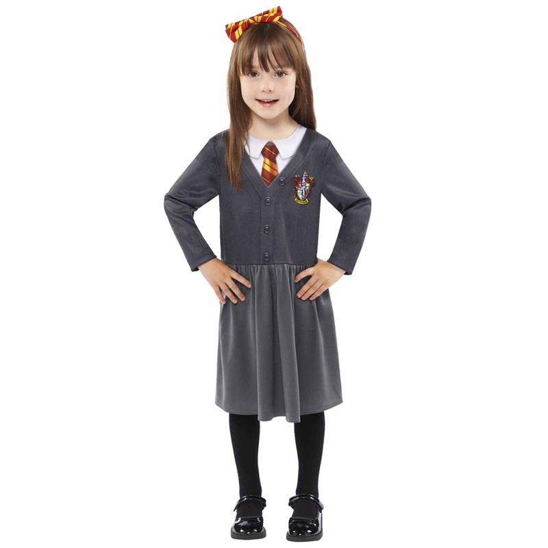 Officially licensed Harry Potter Hermione costume with printed dress with Gryffindor badge and school colours headband.