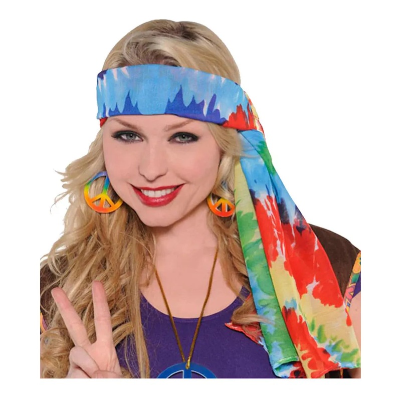 Hippie Tie Dye Headscarf. 1960's Colourful Fabric Bandana.One large, colourful tie dye headscarf.Measures approx 160cm x 60cm.Quality sheer fabric scarf.Earrings and jewellery not included.Step right out of the 1960s with this Hippie Tie Dye Headscarf. Thi