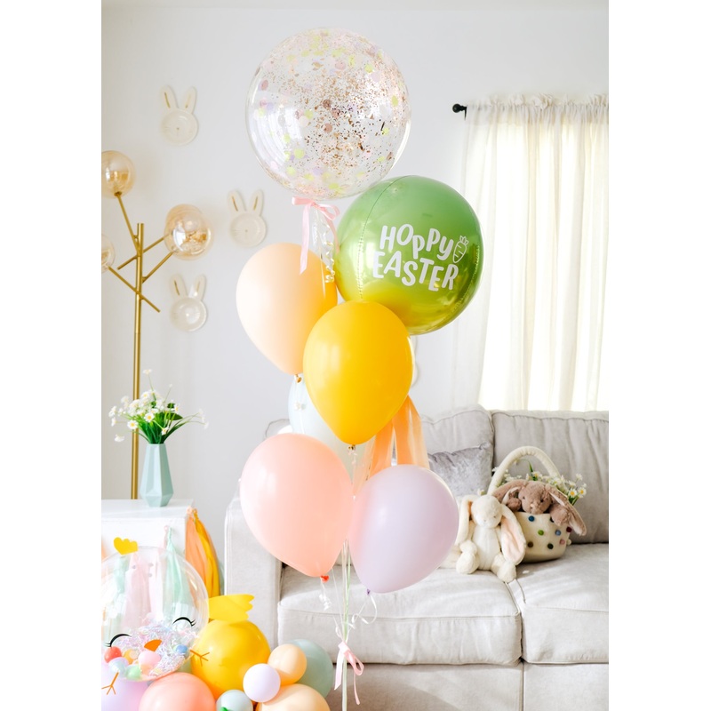 Balloons will add some color and shine to your Easter brunch or egg hunt! This bright and sparkly set includes a glittery confetti bubble, 5 premium latex balloons, and our signature tassel orb with an exclusive Easter design.