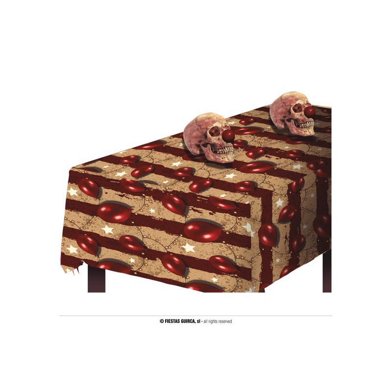 Plastic Halloweenclown themed tablecover measuring 137 x 274 cm.