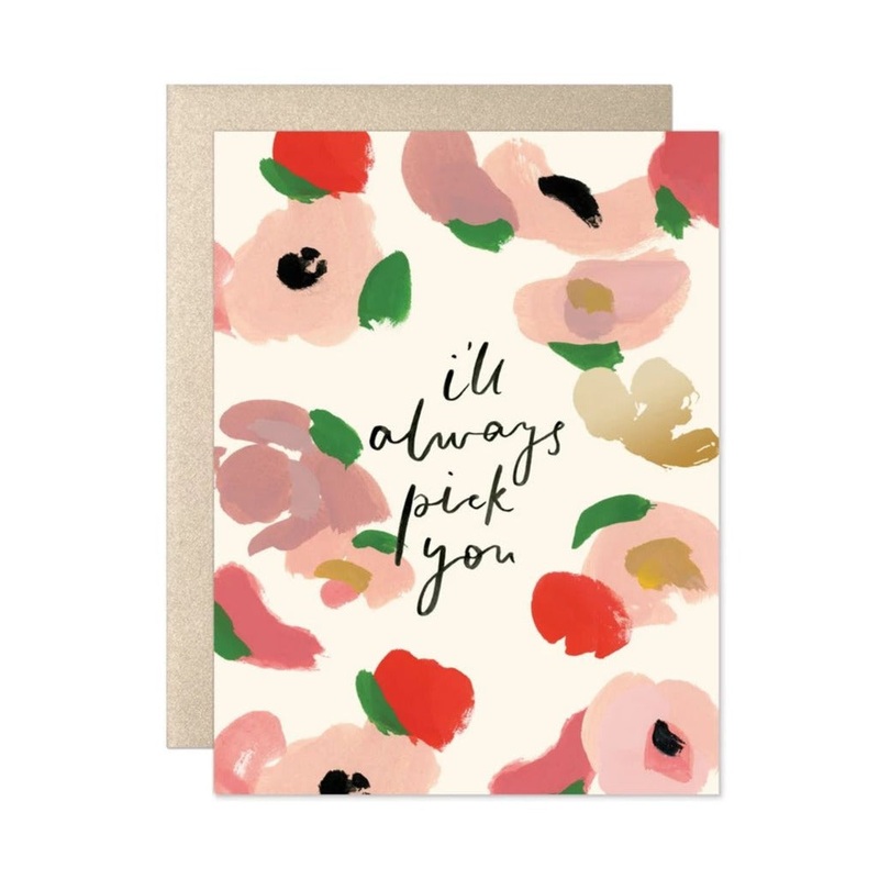 Colorful painterly florals decorate the front side of this card with the reminder “I’ll always pick you” written in modern calligraphy. A sweetsentiment for the friend or partner who you’d always choose time & again because they’re simply the best!