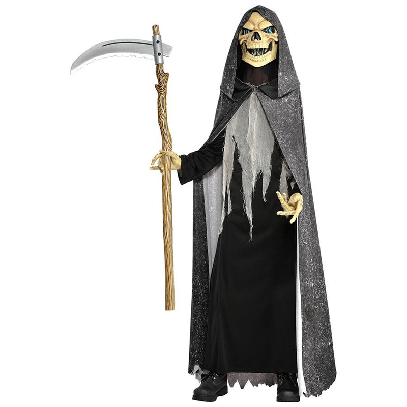 Illusion Reaper Kids Costume includes: Stuffed structure w/attached molded skull, Hooded Gloak and Long Sleeve robe.