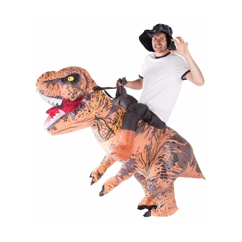 Pretend you've been transported to Jurassic World with this inflatableunisex T-Rex dinosaur costume consisting of full body zip up jumpsuit with hat & built in fan.One size fits most adults. Fan inflates costume in seconds & lasts up to 7 hours. Requires 4