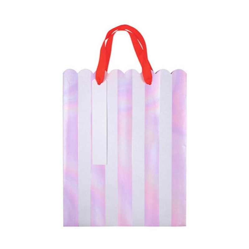 These luxury gift bags are decorated with an iridescent foil-striped pattern and neon coral cotton handles.
