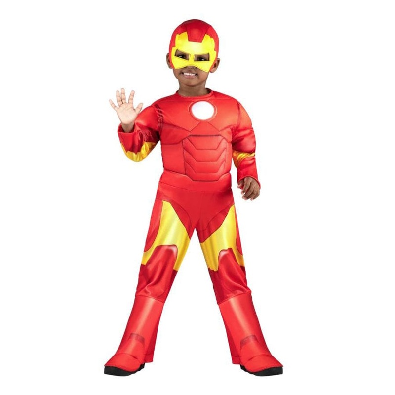 Jumpsuit includes padding in the chest, arms, and boot tops in addition to a hook and loop fastener. It also includes a fabric mask with a foam interior and an elastic strap. Officially licensed MARVEL product from Jazwares.