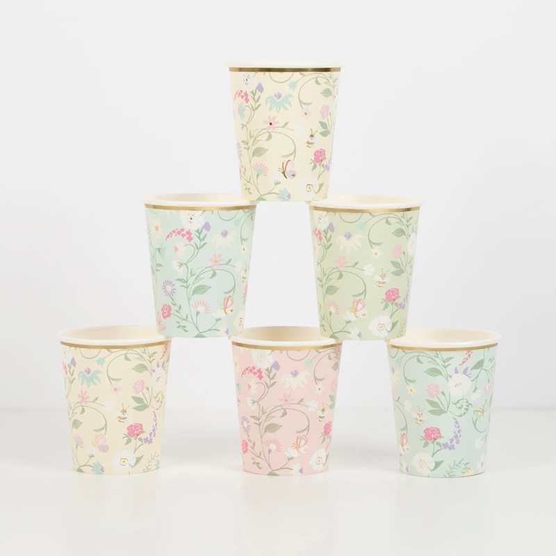 Partnered with Laduree to create these beautifulcups, the exquisite floral design, colors and gold foil details are oh-so-lovely!Gold foil detailsSuitable for hot and cold drinksPack of 8 in 4 colors:pink, mint, light blue or creamProduct capacity: 9oz3 x
