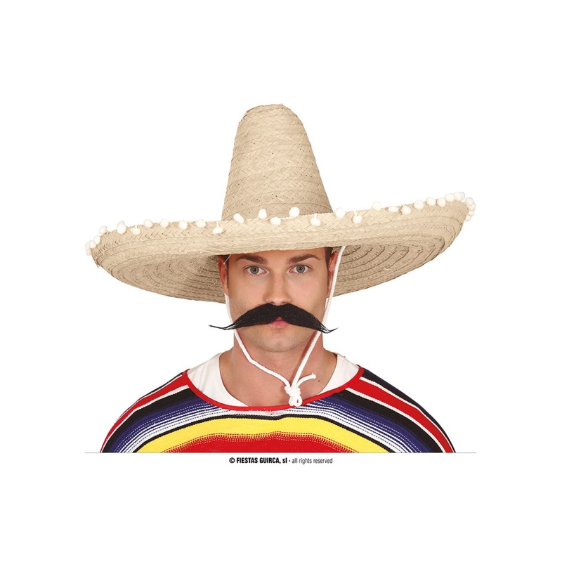 Neutral coloured 60 cm Mexican straw sombrero with white bobble trim and cord.