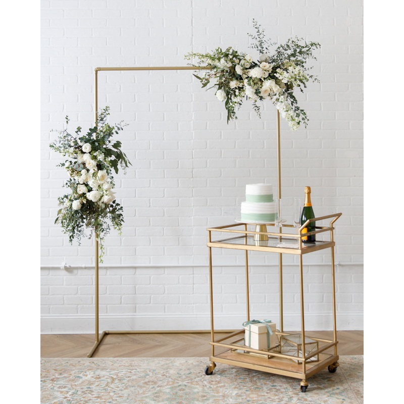 Freshest in the first 1-3 days. See Longevity Notes.Arrives arranged and watered.Rental: Includes install and tear down.FeaturesThis Includes:- 4x7 Gold Frame- Two Floral ArrangementsElevate your event with this frame and floral pair. With our signature go