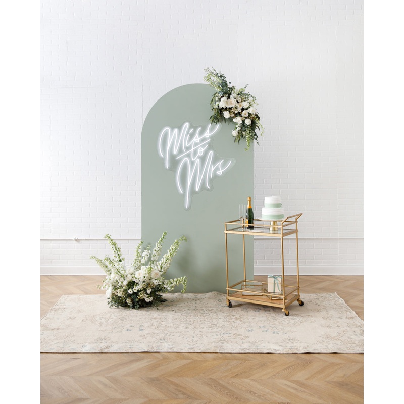 Your celebration will be inspired and beautiful with this panel and floral set. With a modern design and sophisticated floral statement peices, you can’t help but fall in love. Add a stunning balloon garland for addtional impact to this display. Our signature Miss to Mrs Neon adds a bright touch to this stunning design.