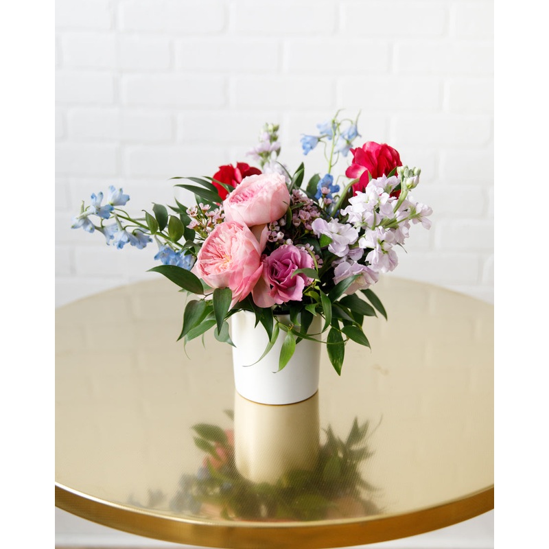 Set the table in style with our beautiful Le Marie inspired floral arrangement set! In bright shades of magenta, purple and blue, these small centerpieces include garden roses, ranunculi and lisianthus to create a truly one of a kind look. Your table will blossom! Place these along your dining table, around the bar or on highboys to dress up any space.