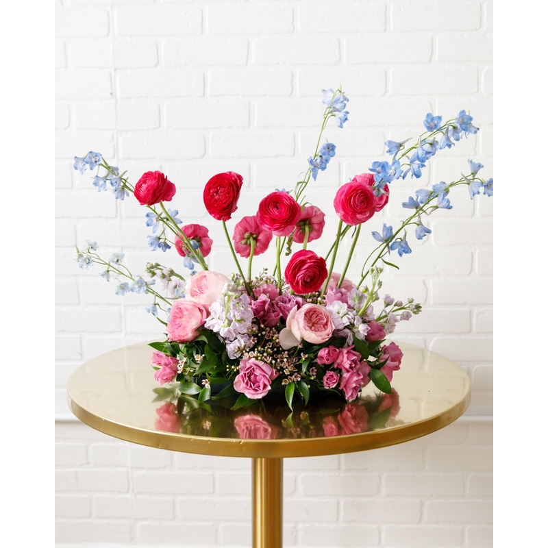 Our signature Jardinire is the ultimate floral centerpiece your celebration must have! This gorgeous arrangement in Le Marie inspired shades includes garden roses, lisianthus and ranunculi that bring any table to life. This set includes two, perfect for your dining table, bar or sweets table.