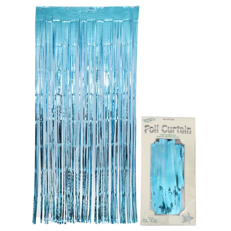 Metallic light blue 1 piece foil door curtain measuring 0.9 m x 2.4 m (3 ft x 8 ft).