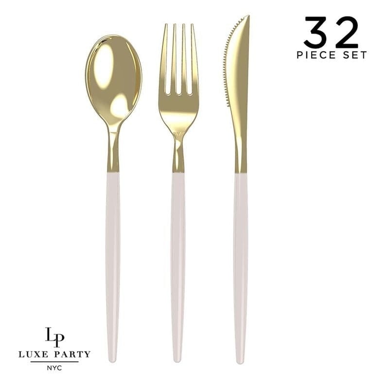 A linen and gold set of heavy duty plastic cutlery for that classy occasion minus the post-party clean up!These two-tone cutleryis an easy way to add some shine to your next celebratory meal.Pack contains32 cutlery pieces - (8) knives, (16) forks, & (8) sp
