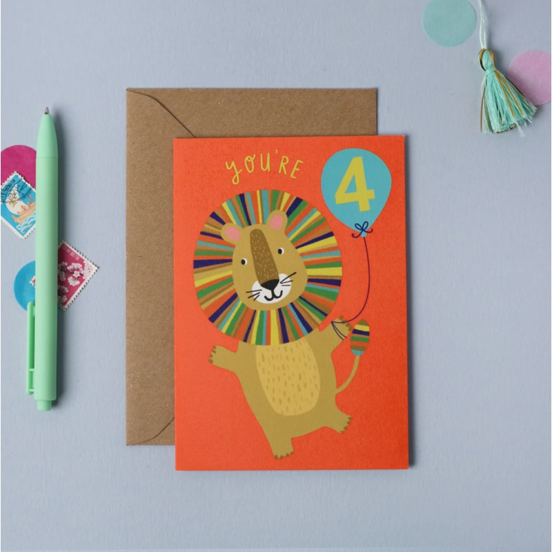 Make a little ones fourth birthday unforgettable with this colourful lion-themed birthday card! Featuring a fun, playful lion with a bold rainbow mane and a festive balloon, this card is perfect for celebrating a 4-year-olds big day. The bright orange back