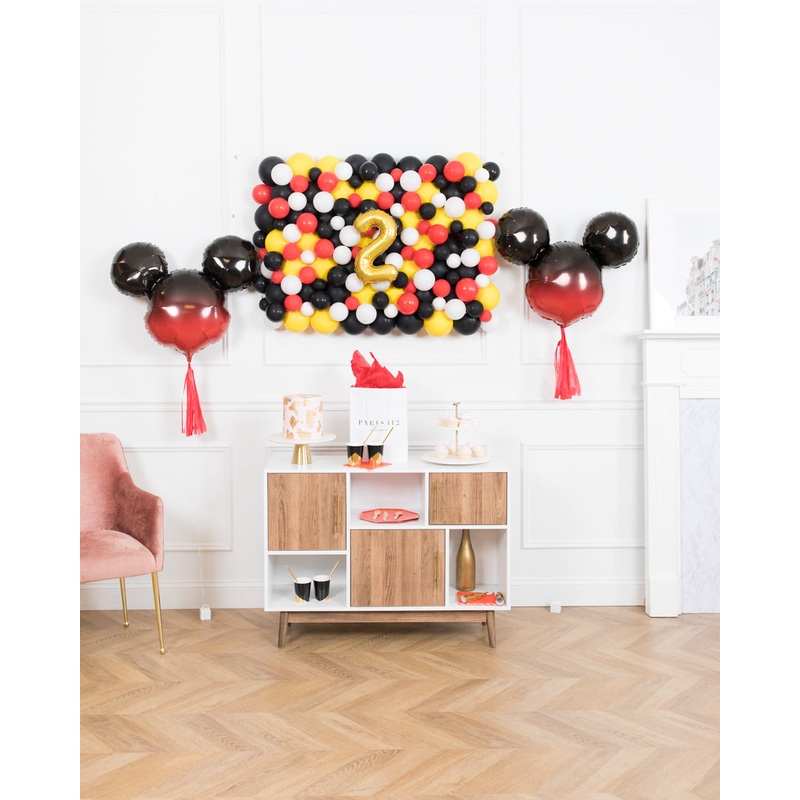 Make the ultimate birthday backdrop with this fun and festive Mickey Mouse inspired backdrop. This set includes two mickey mouse mylar, and a colorful balloon wall to create an unforgettable party.