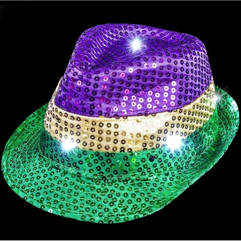 Have a little fun and add some spark to your party attire with this gold, green, and purple sequin covered light-up fedora! Great accessory for Mardi Gras celebration. LED lights illuminate the hat, Batteries included. One size.