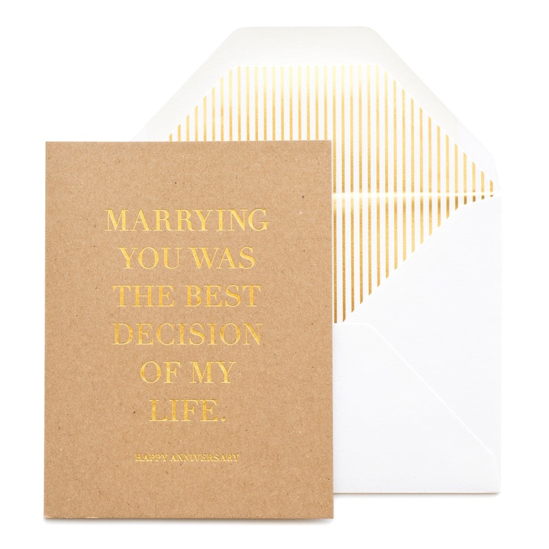Let your partner know how you feel on your anniversary!Letterpress printed by hand on antique machineryGold foil on kraft paper, paired with a white envelope and gold foil pinstripe liner. Folded card, blank inside.