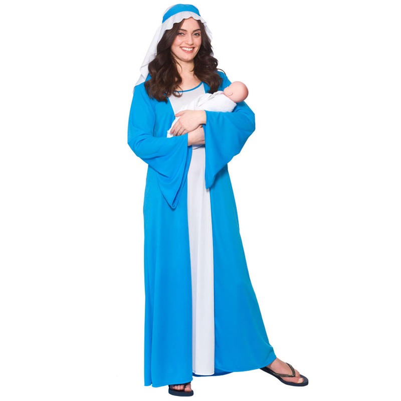 Adult Christmas Nativity Mary costume in two sizes. Includes light blue and white full length dress and headpiece. Baby doll not included.SizeDressStandard12-16Plus Size20-24Note: Measurements are manufacturer's guide.
