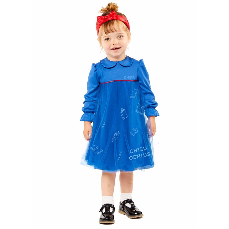 Roald Dahl licensed Matilda infant sized fancy dress costume with blue dress and red headband.