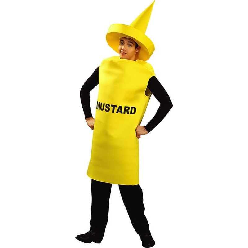 Our Mustard Bottle Adult Unisex Costume will be a hit at any Halloween Party The Mustard Bottle costume is great costume for singles or couples just pair with our Ketchup Bottle costume for a fun couples costume look This Mustard Bottle unisex adult costum