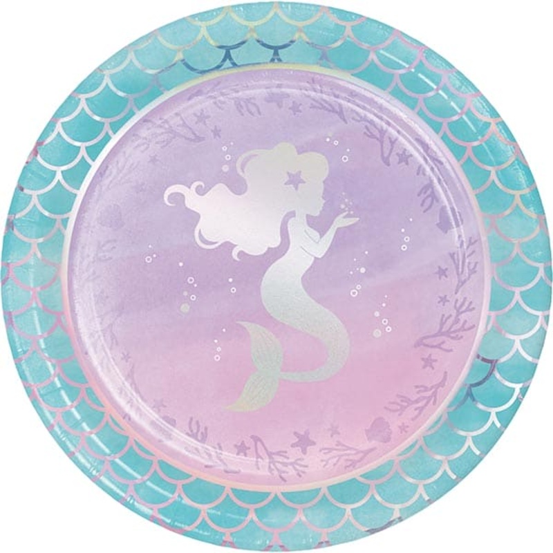 The package includes 8 Mermaid Shine 8.75in Round Dinner Paper Plates.
