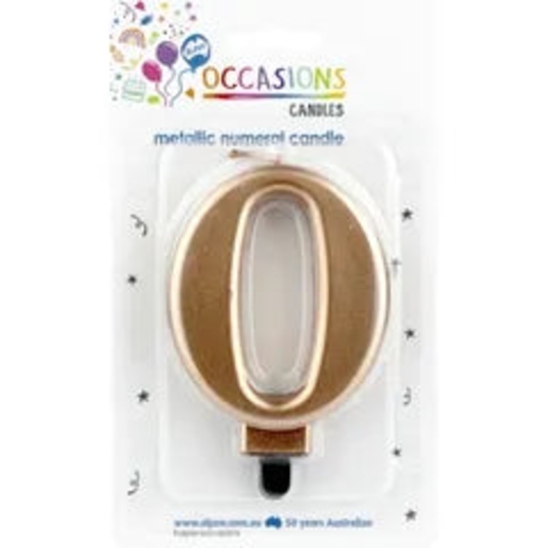 Metallic Rose Gold Number 0 Candle.Candle measures 7.5cm tall x 5.5cm wide.This metallic rose gold number zero candle makes an elegant way to finish off a birthday cake - team it with other rose gold number candles to create the age you require.