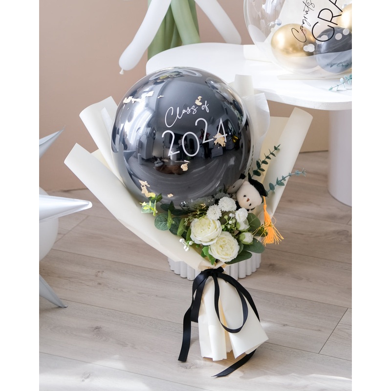 Say a big "Congrats Grad" to the new graduations with a personalized mini bouquet! This hand wrapped balloon is accented with a metallic flakes, an adorable bear wearing a tiny grad cap and charming faux florals.Colors: Choose one balloon color or list the