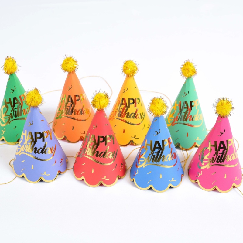 Mini birthday hats in every color! Adorned with sparkly poms at the top and gold foil lettering. These hats are a fun addition to any birthday party celebration.8 hats per package (1 of each color)4.75in