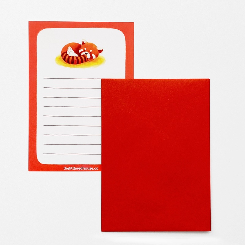 This letter and envelope set features a sleepy red panda. Letters to your pal can't get any cuter than this! Each letter set includes 6 letter sheets and 3 matching envelopes Paper size: 3.5 x 5 inches Envelopes Size : 4bar
