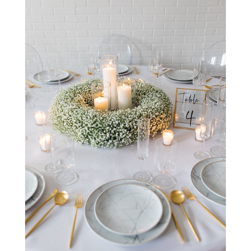 Freshest in the first 1-3 days. See Longevity Notes. Arrives arranged and watered.FeaturesThis Includes:- Baby's Breath Wreath- Three Pillar Candles with VaseElevate your wedding decor with our Minimal Floral Wreath and Candle Centerpiece Set. This modern