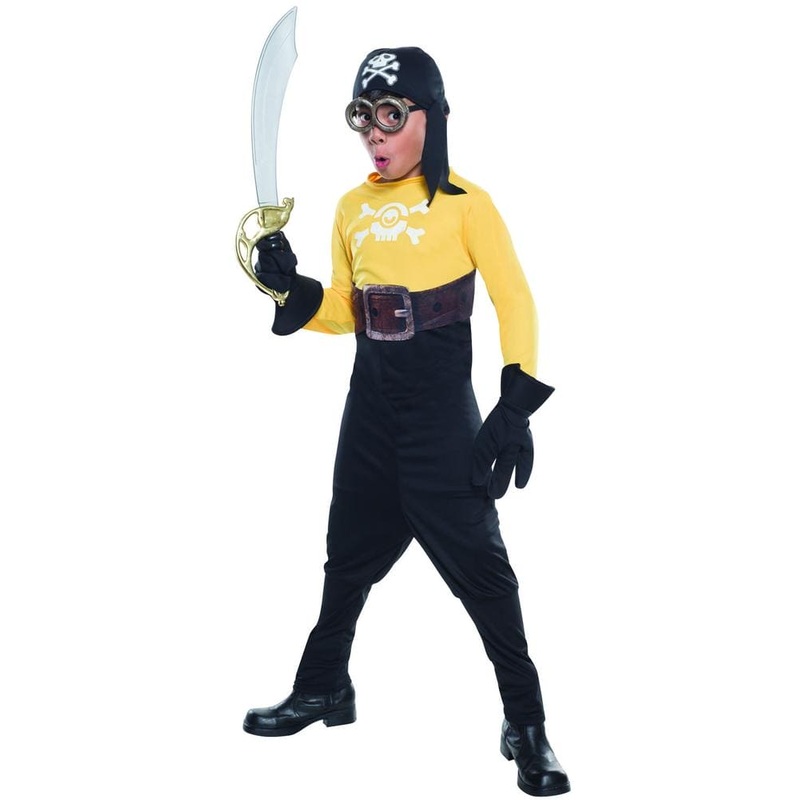From the Despicable Me movies to their own movie this minion is ready for adventures out to sea as a pirate Our officially licensed Minion Pirate Child Costume includes a jumpsuit with an attached brown belt a character headpiece a pair of gloves and goggles.