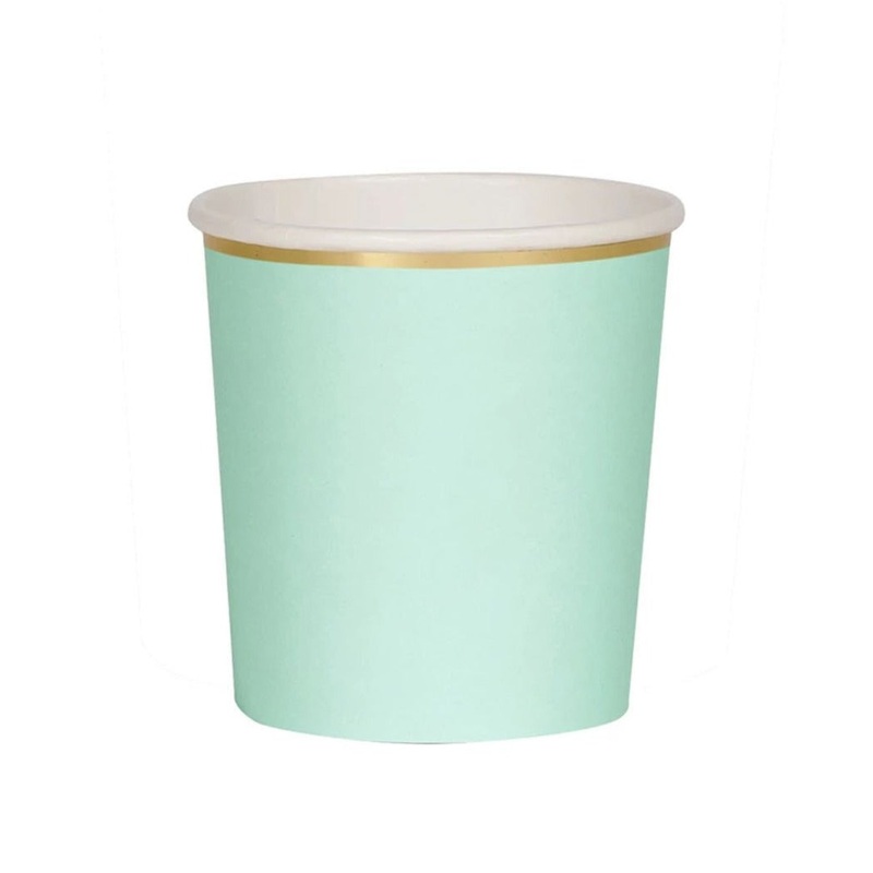 Serve some drinksin thesecool mint tumbler cupswith subtle gold detail. These cute paper cups with soft mint color will add some class to any baby shower or birthday party table decor. Keep your color scheme on point with our other mint colored decorations